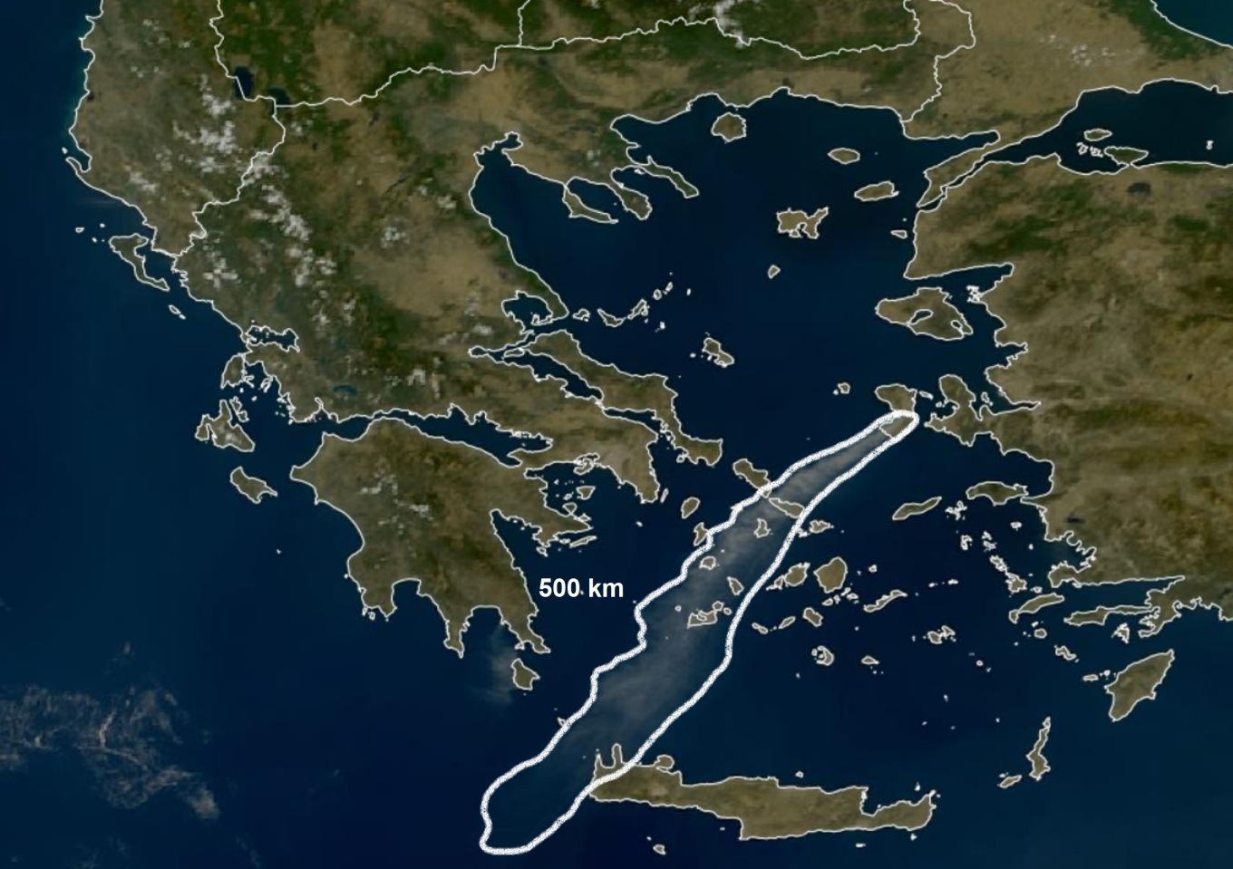 Και συμπληρώνει: «Όπως βλέπουμε από το δορυφόρο, οι καπνοί, λόγω των ισχυρών Βορειοανατολικών ανέμων που φτάνουν τα 6-7 μποφόρ, έχουν ταξιδέψει περίπου 500 km μακριά και έχουν ξεπεράσει ακόμα και το Δυτικό κομμάτι της Κρήτης. Δυστυχώς αλλά δεν φαίνεται να εξασθενούν οι άνεμοι για τις επόμενες 2-3 ημέρες και έτσι θα πνέουν με εντάσεις 4-6 και κατά διαστήματα 7 μποφόρ (οι ριπές)».