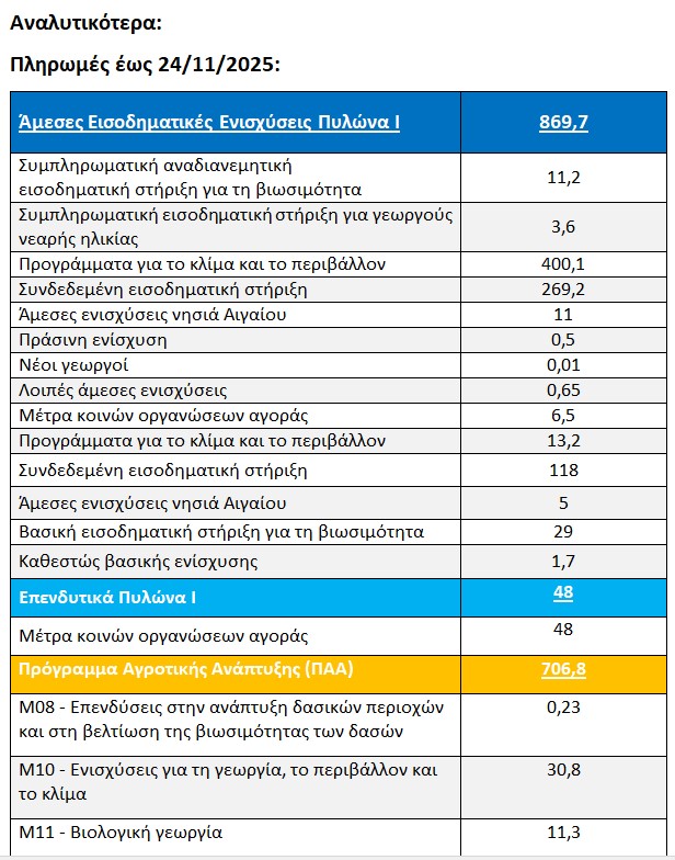 Τα ποσά που έχουν καταβληθεί στους αγρότες από 1/1/2025 έως 1/12/2025, υπενθυμίζουν πηγές της Αντιπροεδρίας της Κυβέρνησης, παρουσιάζοντας και τα τελευταία, επικαιροποιημένα στοιχεία.