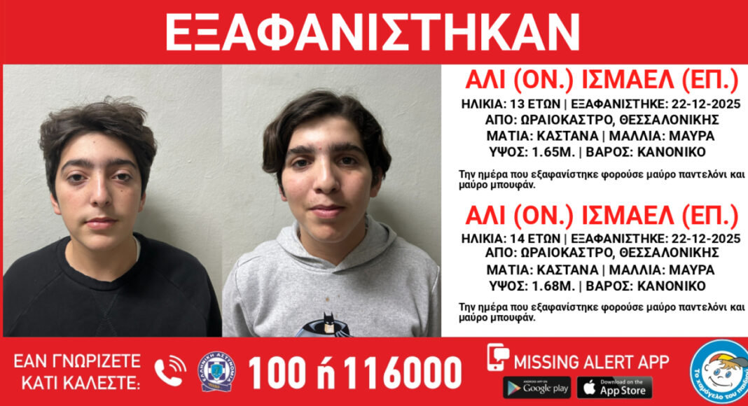 Συναγερμός έχει σημάνει στην περιοχή του Ωραιοκάστρου Θεσσαλονίκης, καθώς εξαφανίστηκαν τη Δευτέρα από χώρο φιλοξενίας ασυνόδευτων ανηλίκων ένας 13χρονος κι ένας 14χρονος, αμφότεροι συριακής καταγωγής, που φέρουν το ίδιο όνομα, Ισμαέλ Αλί.