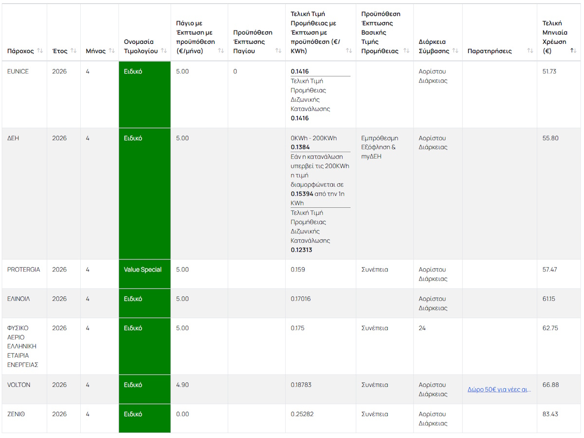 Το Μάρτιο οι τιμές των πράσινων τιμολογίων ηλεκτρικού ρεύματος ξεκινούσαν από τα 9,2 λεπτά ανά κιλοβατώρα και έφταναν μέχρι τα 16,6 λεπτά. Πλέον το εύρος είναι από 14,1 έως 25,8 λεπτά, με βάση τον κατάλογο που δημοσίευσε χθες (1.4.2026) η ΡΑΑΕΥ.