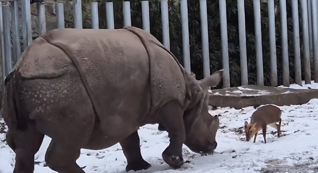 Μια απρόσμενη «αναμέτρηση» εκτυλίχθηκε σε ζωολογικό κήπο της Πολωνίας, με πρωταγωνιστές ένα ελάφι περίπου 20 κιλών και έναν ρινόκερο βάρους σχεδόν δύο τόνων.