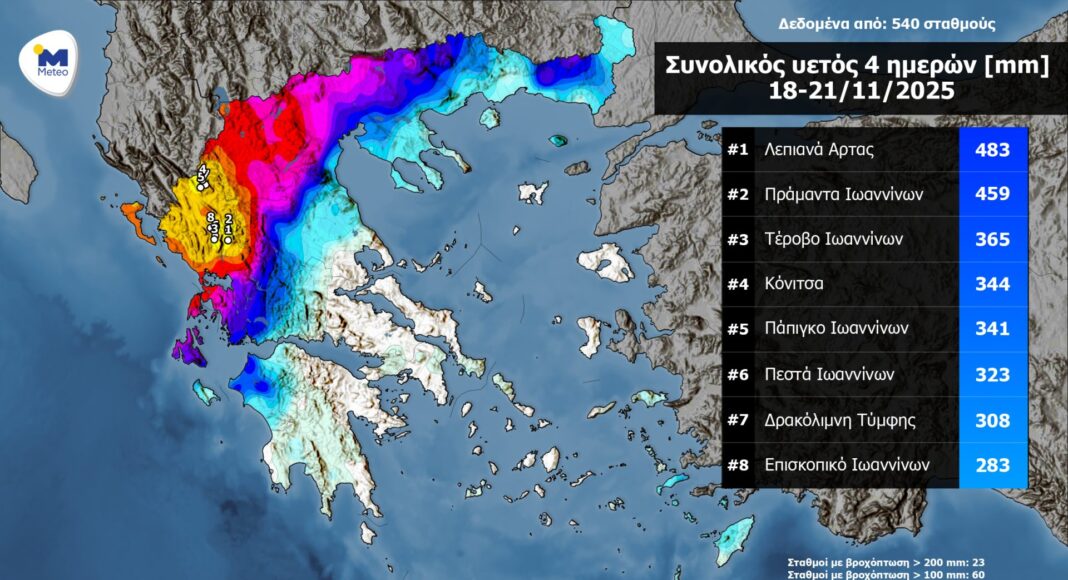 Όπως φαίνεται χαρακτηριστικά στον χάρτη, το ύψος βροχής στα ορεινά της Ηπείρου ξεπέρασε τα 400 χιλιοστά, με ορισμένους σταθμούς να καταγράφουν ακόμη υψηλότερες τιμές. Συνολικά, 23 σταθμοί του δικτύου του meteo.gr / Εθνικού Αστεροσκοπείου Αθηνών κατέγραψαν πάνω από 200 χιλιοστά, ενώ 60 σταθμοί ξεπέρασαν τα 100 χιλιοστά.