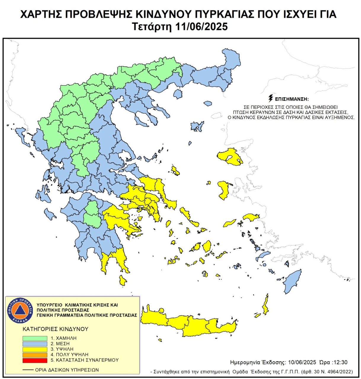 Δημοσιεύτηκε και ο αντίστοιχος χάρτης για την αυριανή ημέρα 11/06, όπου περιλαμβάνει ακριβώς τις ίδιες περιοχές με σήμερα, με μόνη αφαίρεση αυτή της περιοχής της Φθιώτιδας.