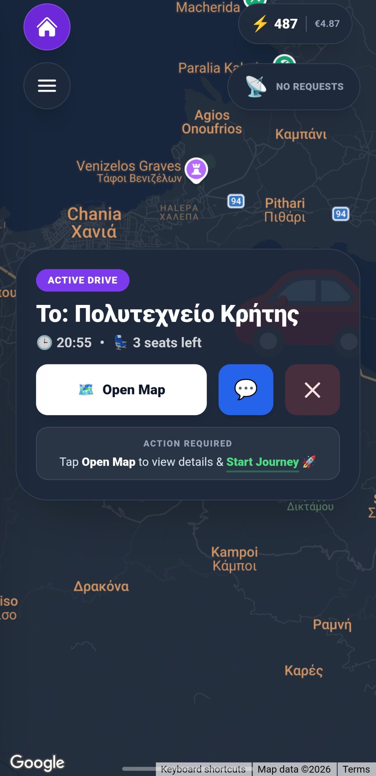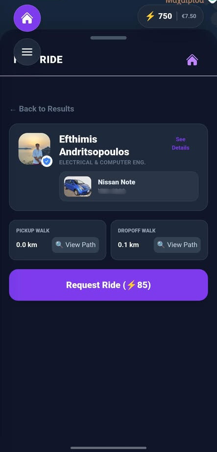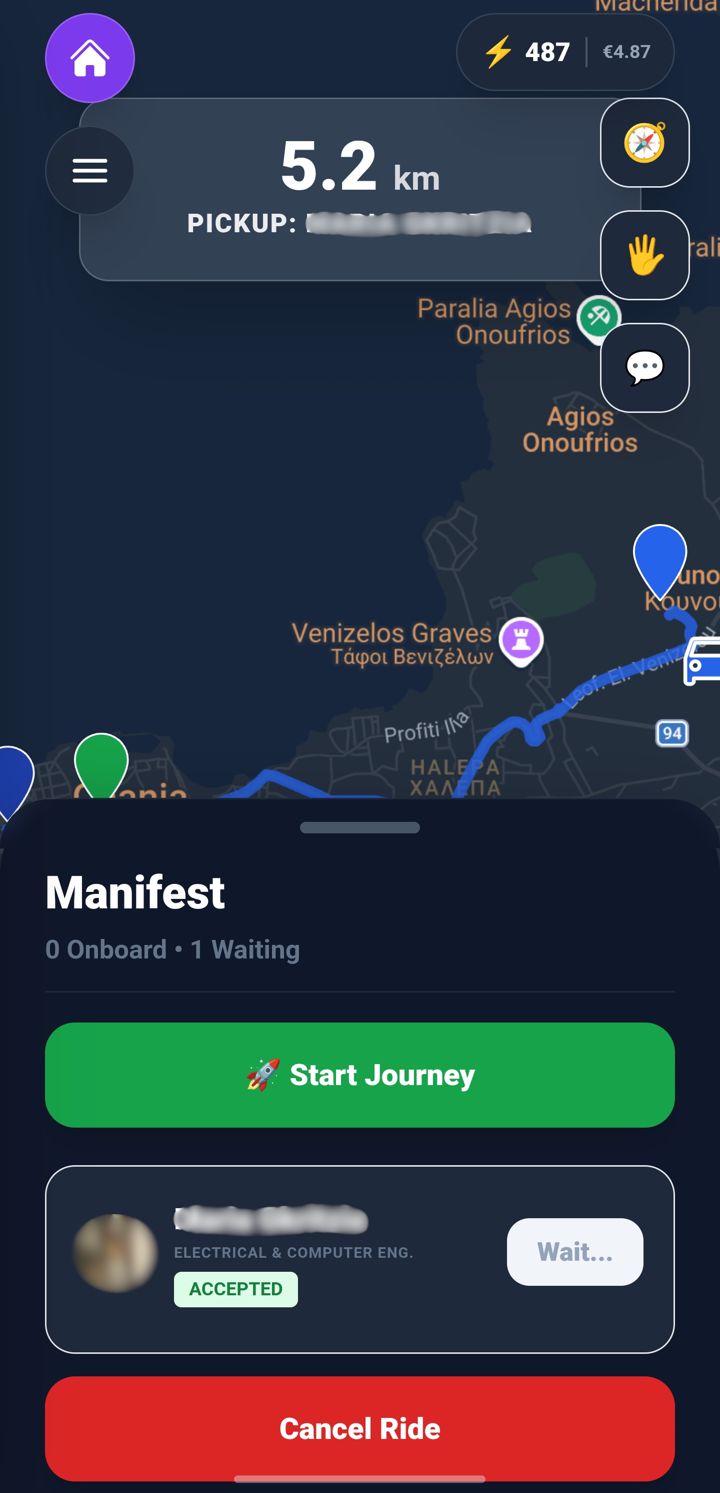 2. Αίτημα Διαδρομής και Automatching: Αν ο επιβάτης δεν βρει διαθέσιμο όχημα, μπορεί να δημοσιεύσει ότι “ψάχνει αμάξι” για συγκεκριμένη ώρα (Request). Οι χρήστες που βρίσκονται κοντά μπορούν να δουν αυτό το αίτημα. Χάρη στο Automatching, με το που ένας οδηγός καταχωρήσει μια διαδρομή που ταιριάζει με το αίτημα, στέλνεται κατευθείαν ειδοποίηση (request) από τον επιβάτη στον οδηγό. Έτσι, δημιουργείται άμεσα προσφορά εκεί που υπάρχει ζήτηση.