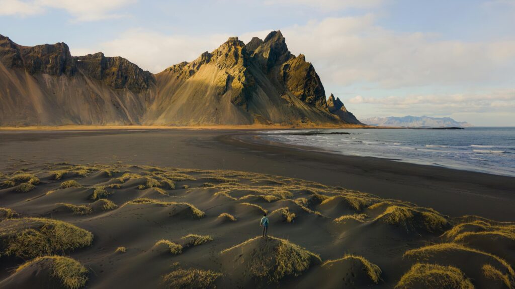 Μια παραλία με μαύρη άμμο και εντυπωσιακή θέα στο βουνό Vestrahorn. Ιδανική για να φωτογραφήσετε το Βόρειο Σέλας.