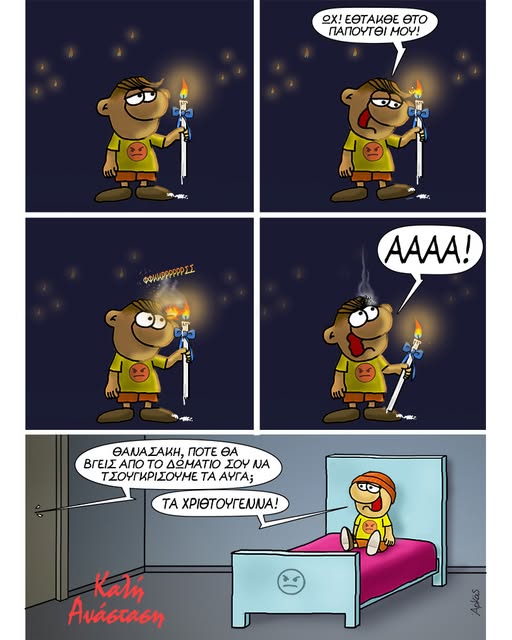 Δεν έλειψαν ωστόσο και οι “μπηχτές” του σκιτσογράφου για την τρέχουσα πραγματικότητα, με έμφαση στην οικονομική κατάσταση των συνταξιούχων της χώρας.