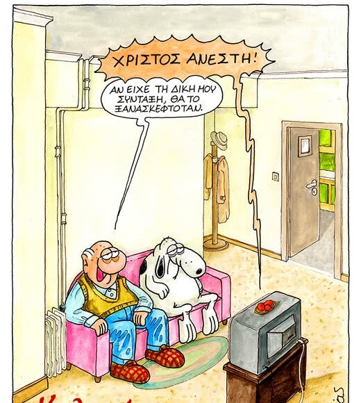 Εδωσε ρεσιτάλ φέτος ο Αρκάς. Με μια σειρά σκίτσων, εμπνευσμένων από το Πάσχα, σκόρπισε άφθονο γέλιο στους θαυμαστές του.