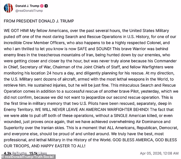 Ο Τραμπ τόνισε ότι αυτή ήταν η πρώτη φορά που δύο πιλότοι των ΗΠΑ διασώθηκαν ξεχωριστά σε εχθρικό έδαφος, και ότι «κανένας Αμερικανός δεν θα εγκαταλειφθεί ποτέ».