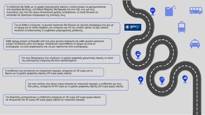 Η ενίσχυση για αυτοκίνητο στην ηπειρωτική Ελλάδα φτάνει στα 50 ευρώ για το δίμηνο με χρήση ψηφιακής κάρτας ή στα 40 ευρώ χωρίς κάρτα. Για νησιωτική περιοχή το ποσό ανεβαίνει στα 60 ευρώ με ψηφιακή κάρτα και στα 50 ευρώ χωρίς αυτή. Για μοτοσυκλέτες, η ενίσχυση διαμορφώνεται στα 30 ευρώ στην ηπειρωτική Ελλάδα και στα 35 ευρώ στη νησιωτική με κάρτα, ή στα 25 και 30 ευρώ αντίστοιχα χωρίς κάρτα.