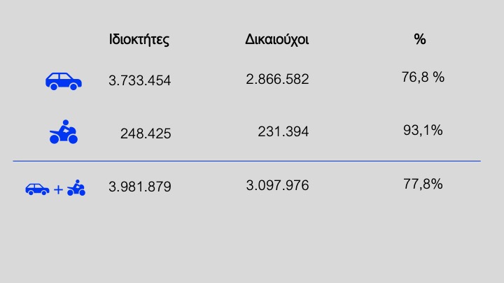 Επιπλέον, το όχημα πρέπει να είναι σε κυκλοφορία, ασφαλισμένο και χωρίς οφειλές από τέλη κυκλοφορίας.