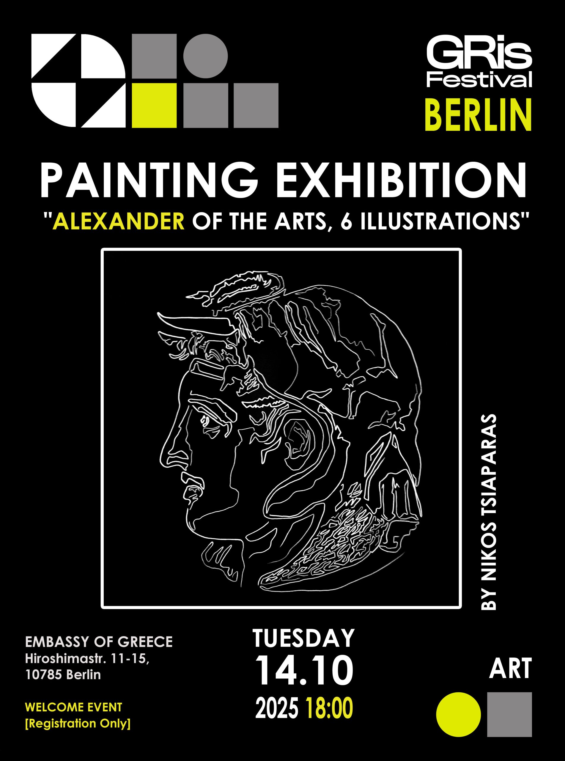 H έκθεση ζωγραφικής αφιερωμένη στον Μέγα Αλέξανδρο που φιλοξενήθηκε στο Νομισματικό Μουσείο Αθηνών θα ταξιδέψει μαζί με τον δημιουργό της καταξιωμένο καλλιτέχνη Δρ Νίκο Τσιαπάρα, καθηγητή του Αριστοτελείου Πανεπιστημίου Θεσσαλονίκης, και θα παρουσιαστεί στο πλαίσιο της εκδήλωσης καλωσορίσματος του Φεστιβάλ από τον Πρέσβη της Ελλάδος στο Βερολίνο κο Αλέξανδρο Παπαϊωάννου, η οποία θα πραγματοποιηθεί στην Πρεσβεία της Ελλάδος στο Βερολίνο, υπό την αιγίδα της οποίας, μεταξύ άλλων, διοργανώνεται και το φεστιβάλ.